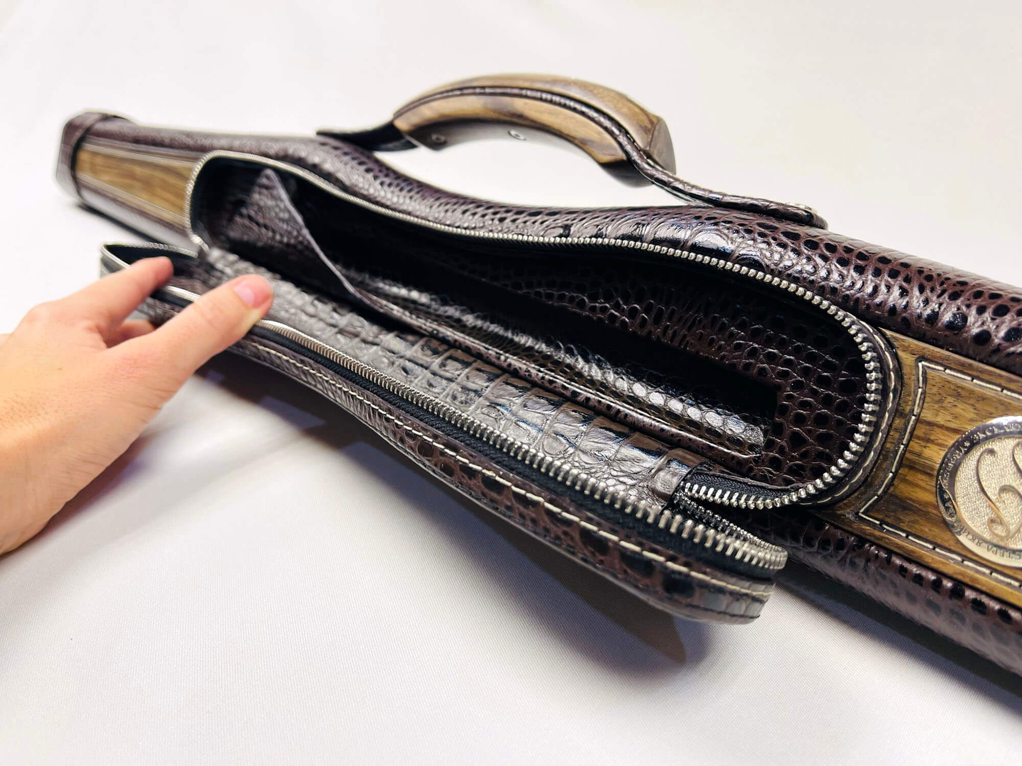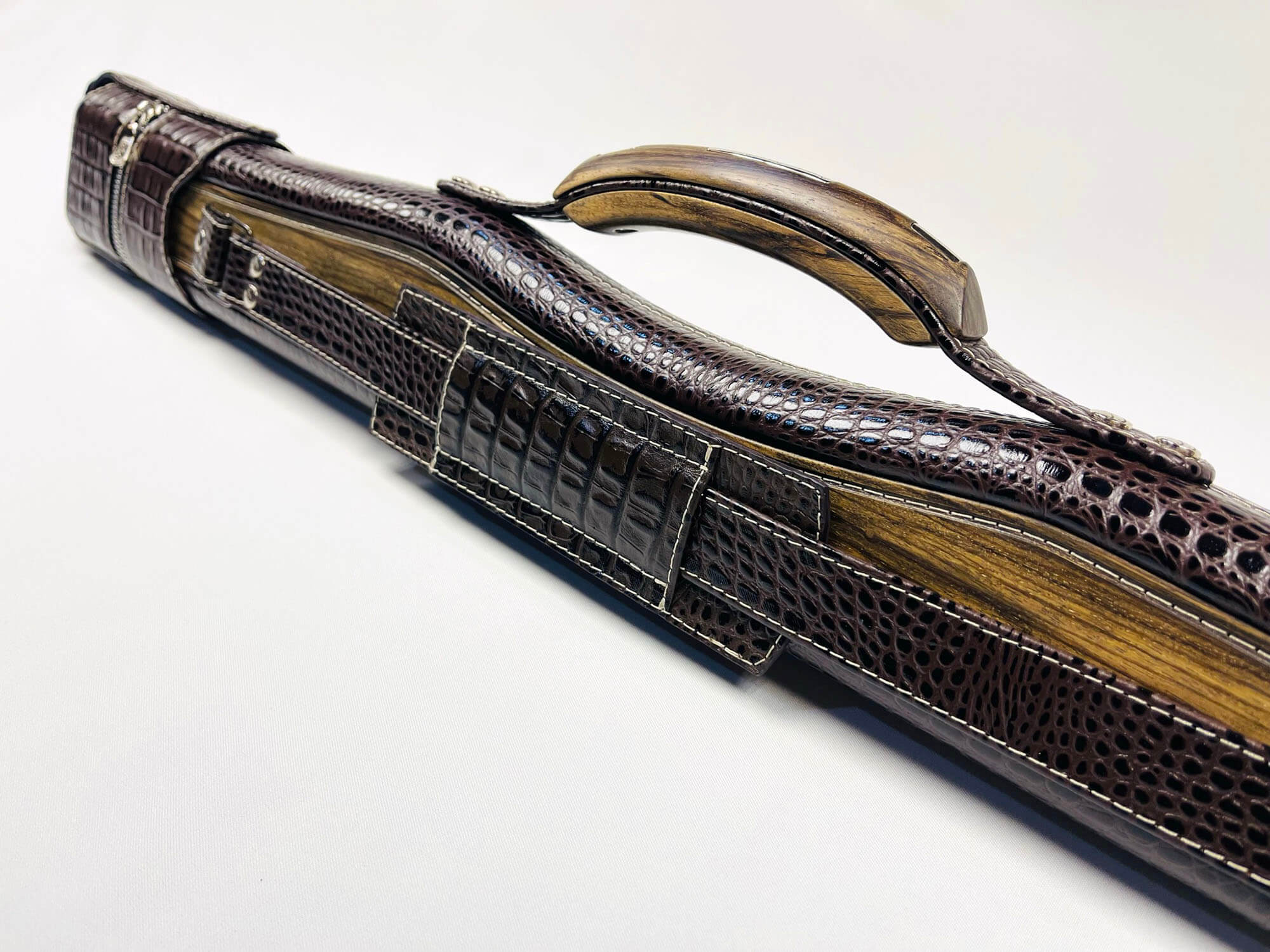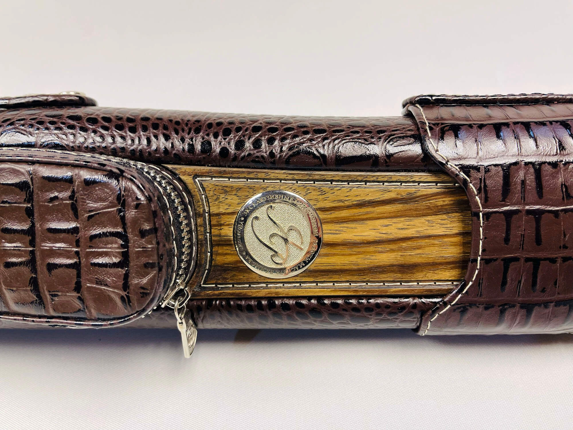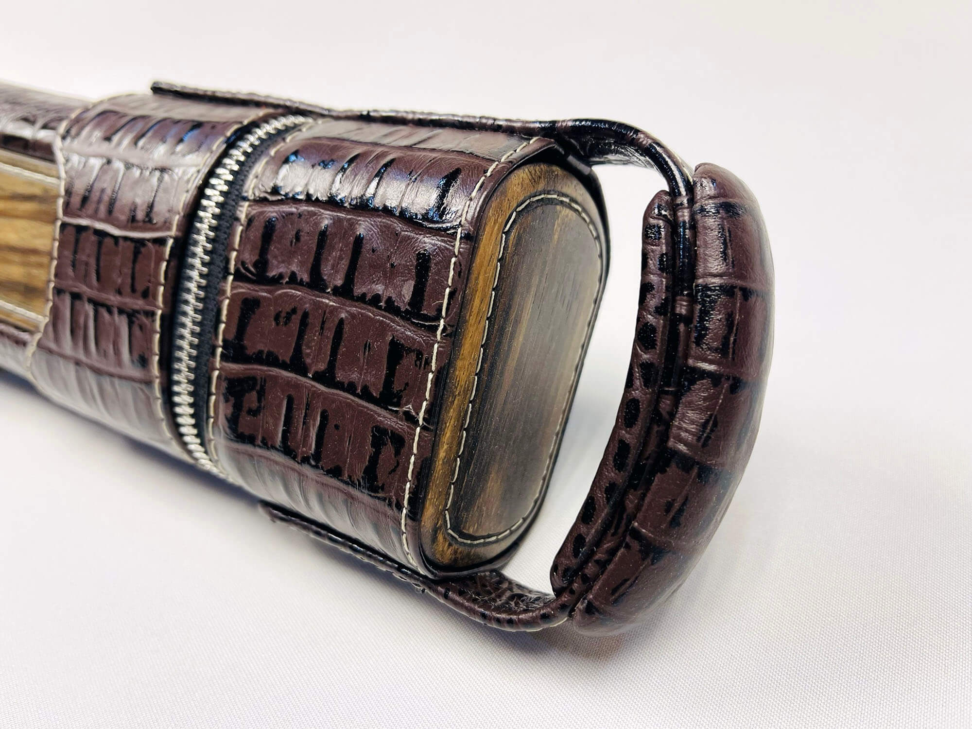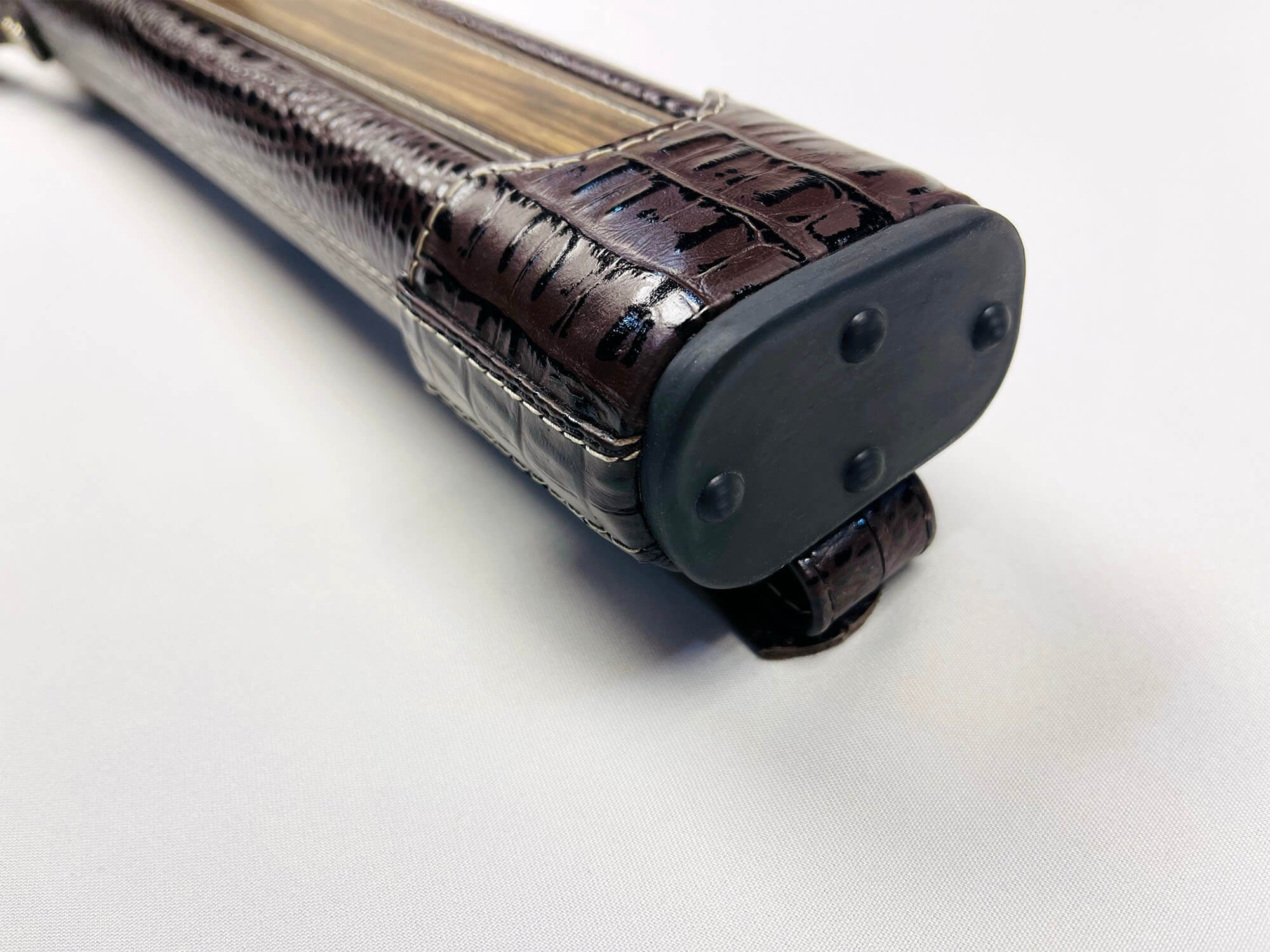 • Авторский тубус для двухсоставного кия изготовлен из легкого и прочного пластика в основании и кожи в сочетании с деревом снаружи