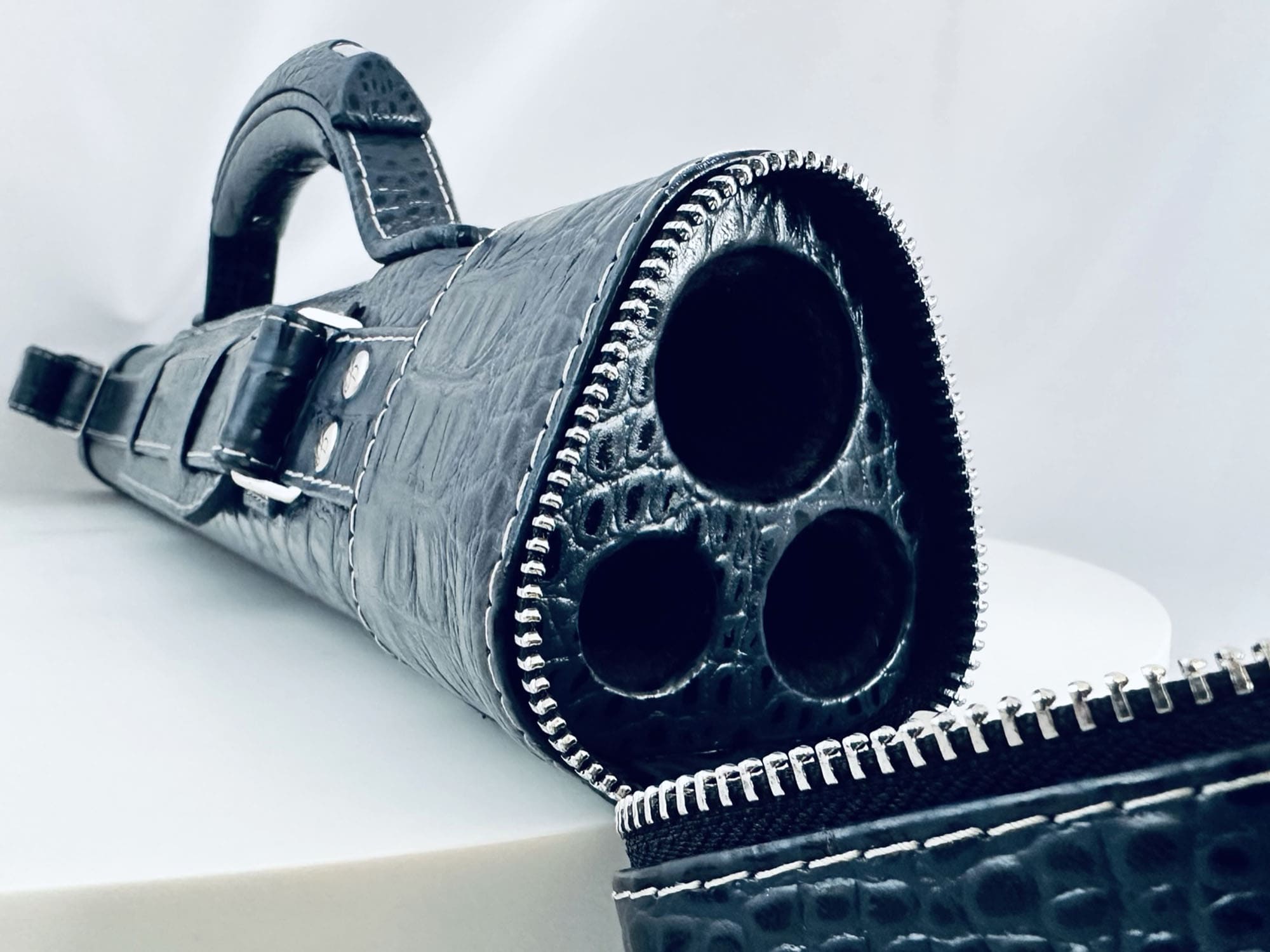 • Авторский тубус для трехсоставного кия изготовлен из легкого и прочного пластика в основании и натуральной тисненой кожи снаружи